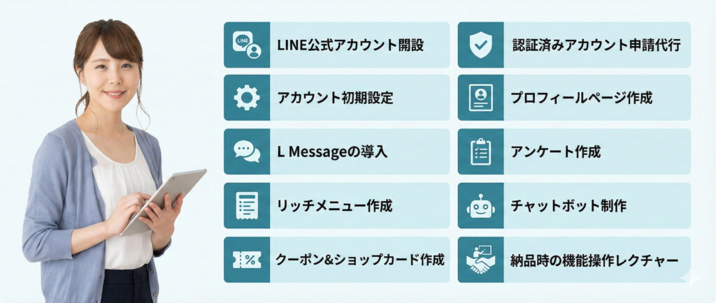 店舗、企業がLINEを通して、情報発信ができ、新規顧客の獲得、リピート促進、さらには人材採用が可能です。
